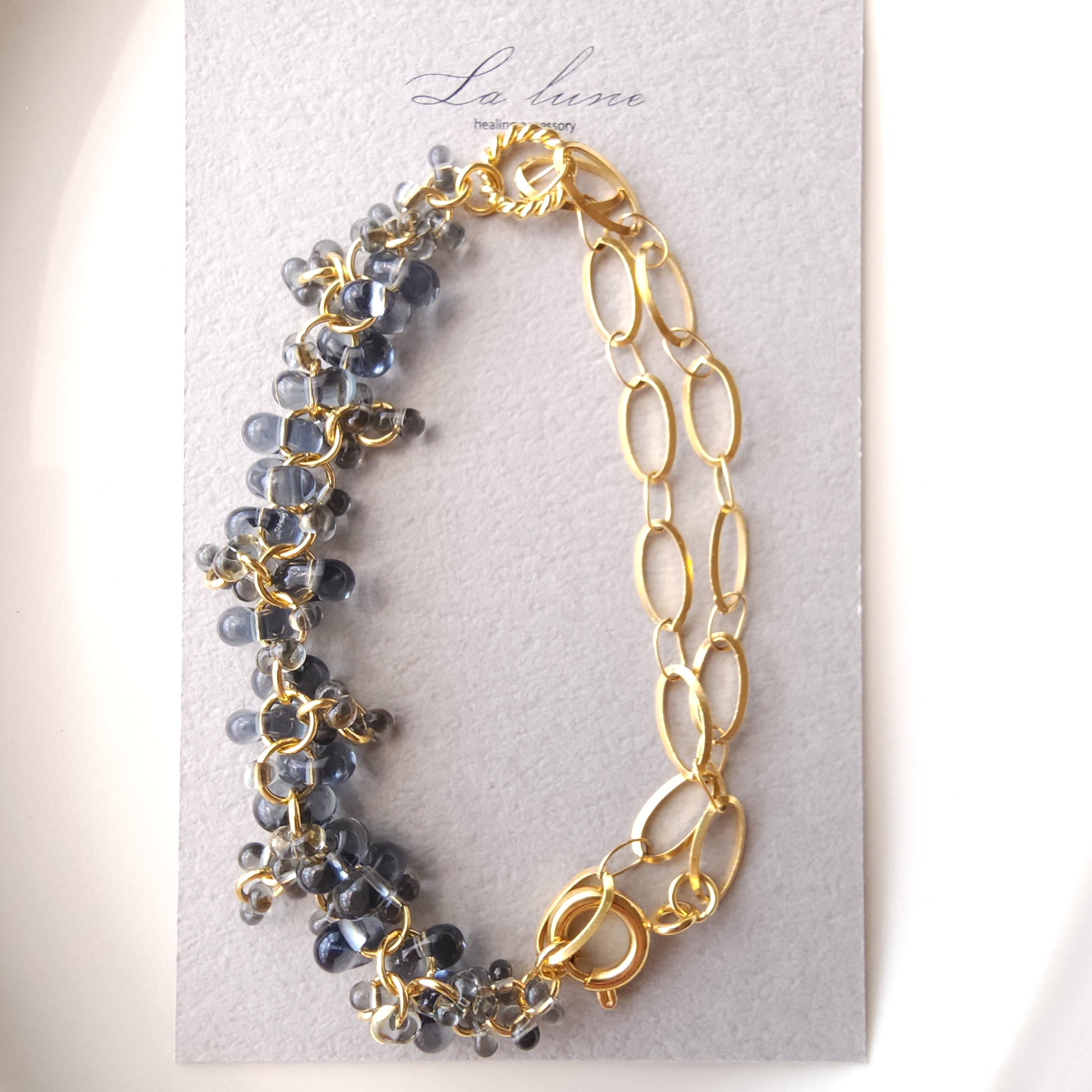 大ビーズ小ビーズをこだわりのバランスで繋ぎ、