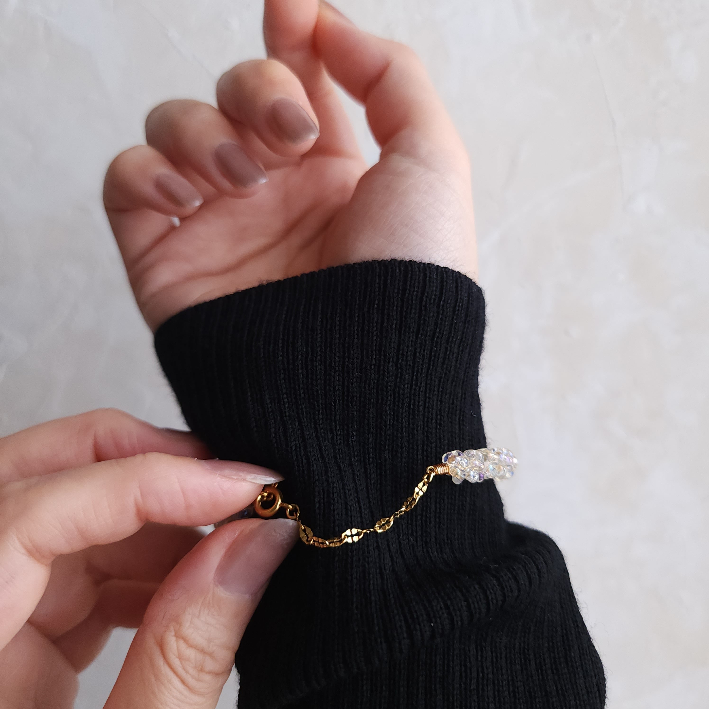 サージカルステンレス素材のデザインチェーンがバングルの落下や紛失を防ぎ、安心してお使い頂けます。